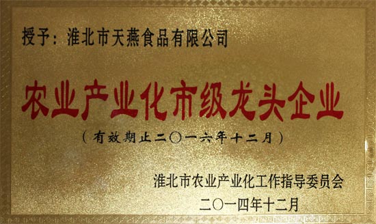 熱烈祝賀淮北市天燕食品有限公司被淮北市農(nóng)業(yè)產(chǎn)業(yè)化工作委員會評為“農(nóng)業(yè)產(chǎn)業(yè)化市級龍頭企業(yè)”。
