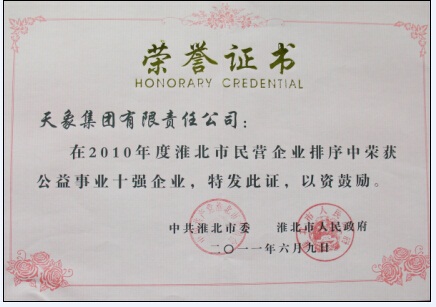 2010年度淮北市民營企業益事業十強企業榮譽證書